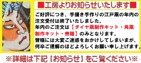 *⌒*■お客様へお知らせいたします■*⌒*⌒*⌒*⌒* ご好評につき、手描き手作りの江戸凧の年内の注文受付は終了いたしました。 年内のご注文は【ダイヤ凧制作キット・角凧制作キット・書籍】のみとなります。 手描き手作りの江戸凧のご注文再開は、2026年1月以降を予定しております。 来年以降でのご注文のお問い合わせ等は下記よりお願いいたします。 皆様には大変ご迷惑をおかけしてしまいますが、何卒ご理解のほどよろしくお願い申し上げます。